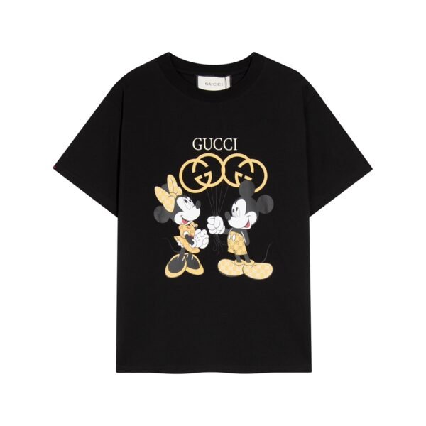 تيشيرت غوتشي الكرتوني الذهبي ذو الرقبة المستديرة والأكمام القصيرة، بطبعة ميكي ماوس المزدوجة.