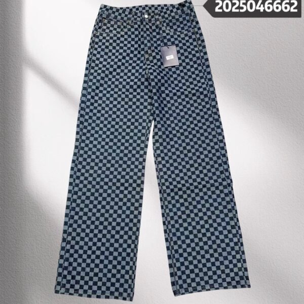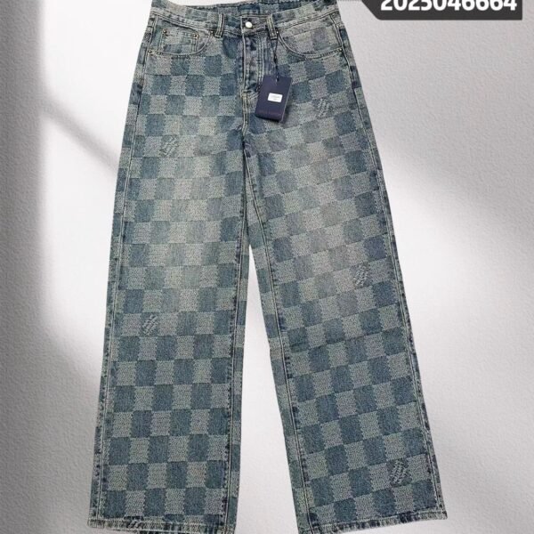 بنطلون جينز لويس فويتون عصري فضفاض بتصميم فسيفساء منقوش، بنطلون جينز رسمي.
