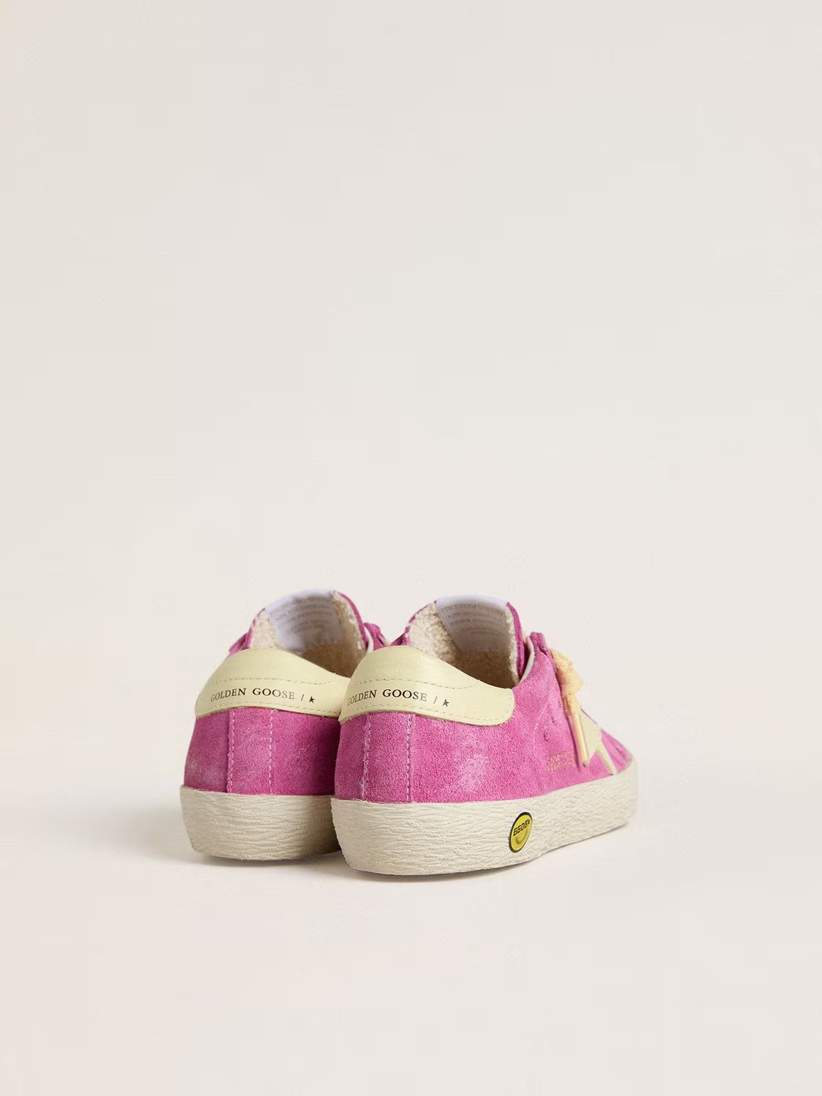 حذاء رياضي أنيق بتصميم “سنيكرز” (sneakers) عصري، يتميز بلون فوشيا (أو وردي زاهي) جريء مصنوع من جلد الشامواه أو ما يشبهه. يبرز الحذاء بوجود نجمة كبيرة باللون الأصفر الفاتح أو الكريمي على الجانب الخارجي لكل فردة، وهي سمة مميزة لعلامة Golden Goose. الأربطة باللون الأصفر الفاتح أو الكريمي تكمل تصميم النجمة وتضفي تباينًا جميلًا. النعل والأجزاء الداخلية للحذاء تبدو بلون أوف وايت أو كريمي، وتعطي مظهرًا “متآكلًا” أو “عتيقًا” بعض الشيء، وهو أسلوب شائع في هذا النوع من الأحذية لإضفاء لمسة عصرية وغير رسمية. هذا الحذاء يجمع بين الراحة والأناقة مع لمسة عصرية وجريئة.