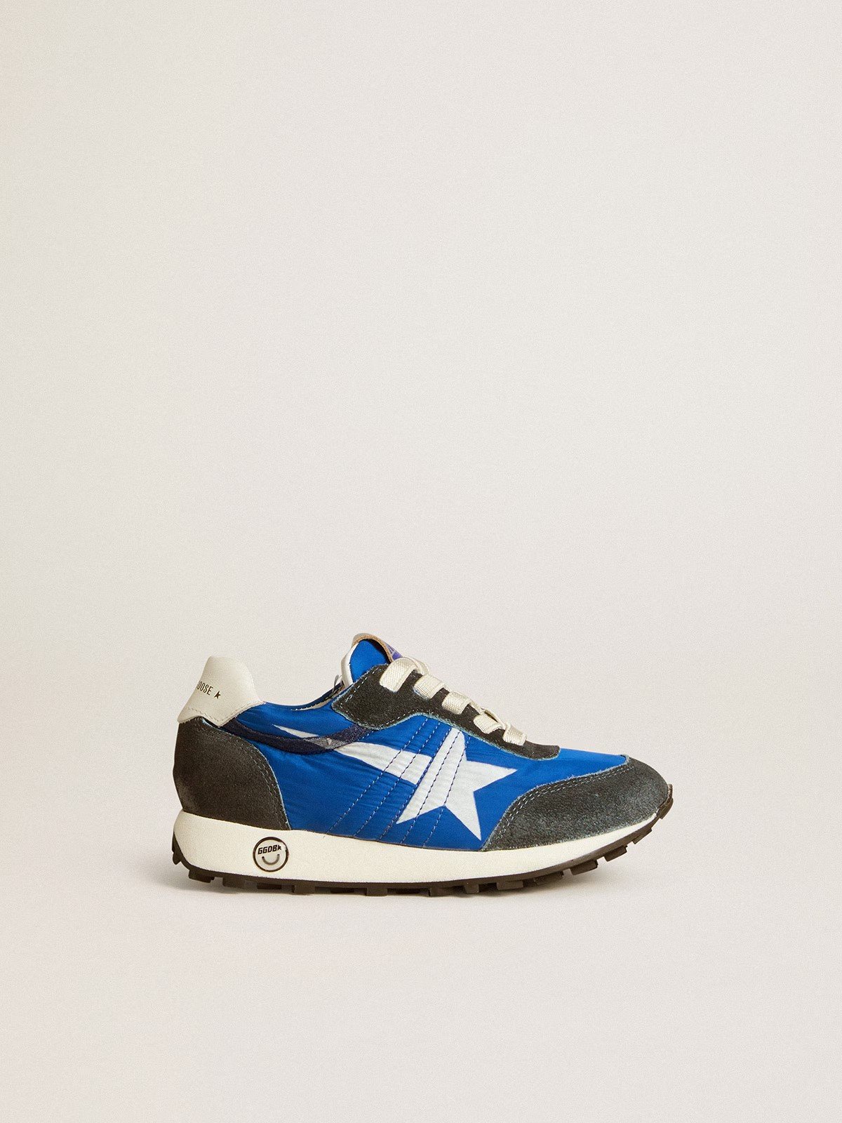 * “يُظهر في الصورة حذاء رياضي عصري يجمع بين درجات اللون الأزرق الزاهي والرمادي الداكن (الأنثراسيت أو الفحمي). يتميز الحذاء بتصميم مريح وعصري، مع نعل أبيض سميك يوفر الدعم. تبرز نجمة بيضاء كبيرة ومحددة على الجانب الخارجي للحذاء، وهي علامة مميزة. الأربطة بيضاء، وتظهر لمسات من اللون الأبيض على لسان الحذاء وحول الكاحل، مما يضيف تباينًا جميلًا. يبدو الحذاء وكأنه مصنوع من مزيج من الأقمشة مثل الشمواه أو الجلد المدبوغ مع أجزاء قماشية مسامية.”