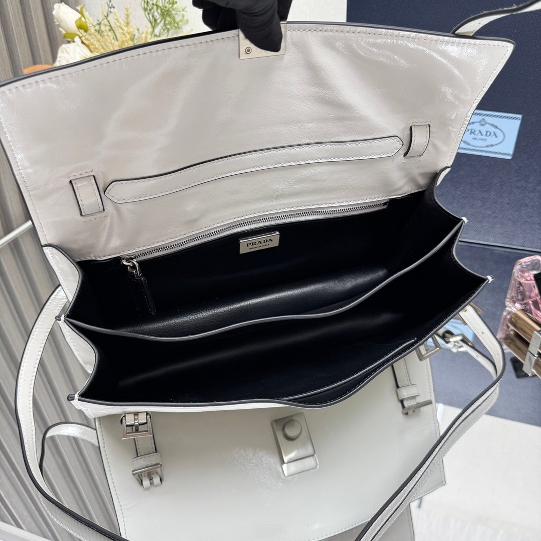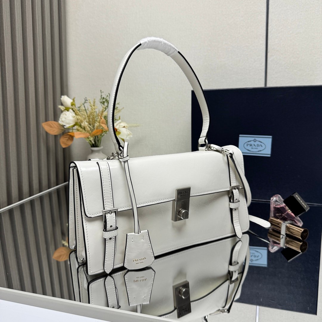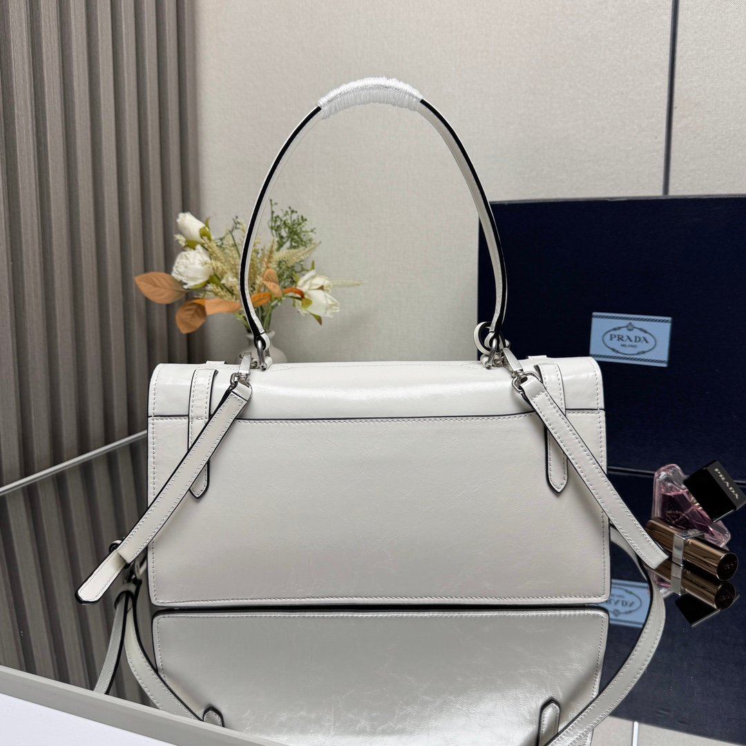 حقيبة يد أنيقة وفاخرة من ماركة برادا (Prada)، وتتميز بتصميم كلاسيكي وعصري في آن واحد. لونها أبيض ناصع، أو ربما كريمي فاتح جداً، مصنوعة من جلد لامع أو مصقول يعكس الضوء بشكل جميل.