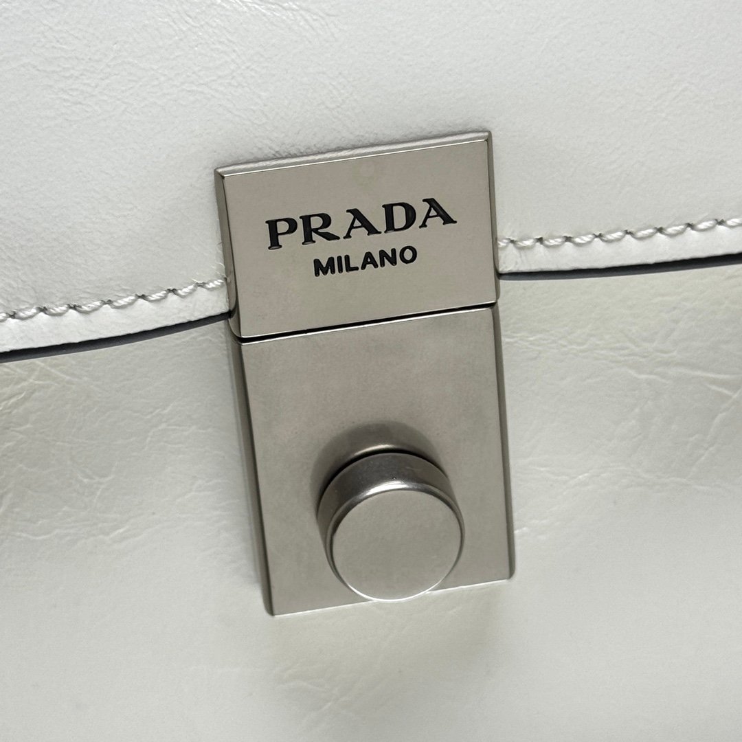 تتمتع الشنطة بشكل مستطيل مع حواف واضحة، وتتميز بغطاء أمامي يغلق بواسطة قفل معدني فضي اللون في المنتصف، يحمل شعار “PRADA MILANO” المحفور. يحيط بالقفل تفصيلان على شكل أحزمة جلدية رفيعة مع أبازيم معدنية فضية على جانبي الغطاء، مما يضيف لمسة مميزة وتفصيل هيكلي للتصميم.
