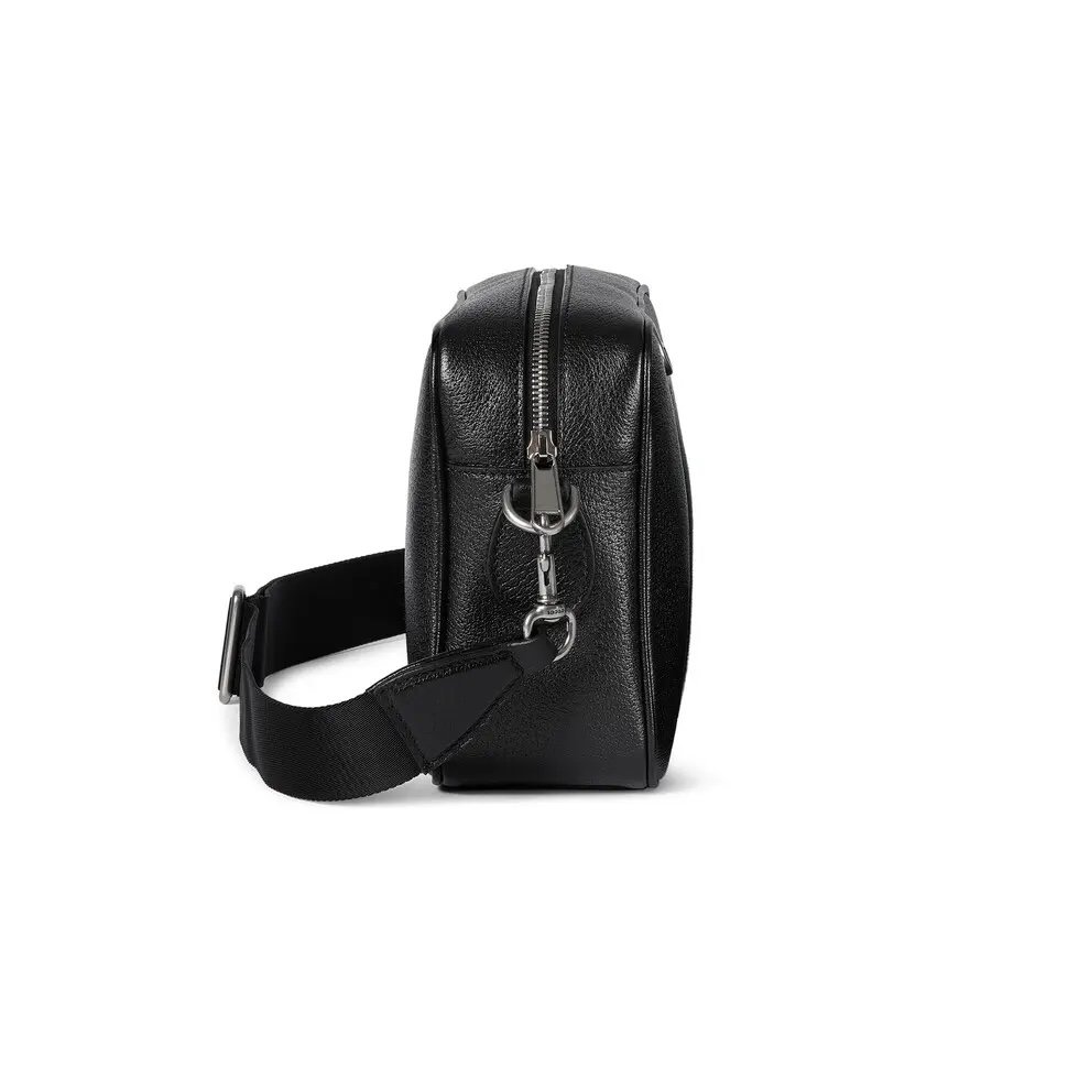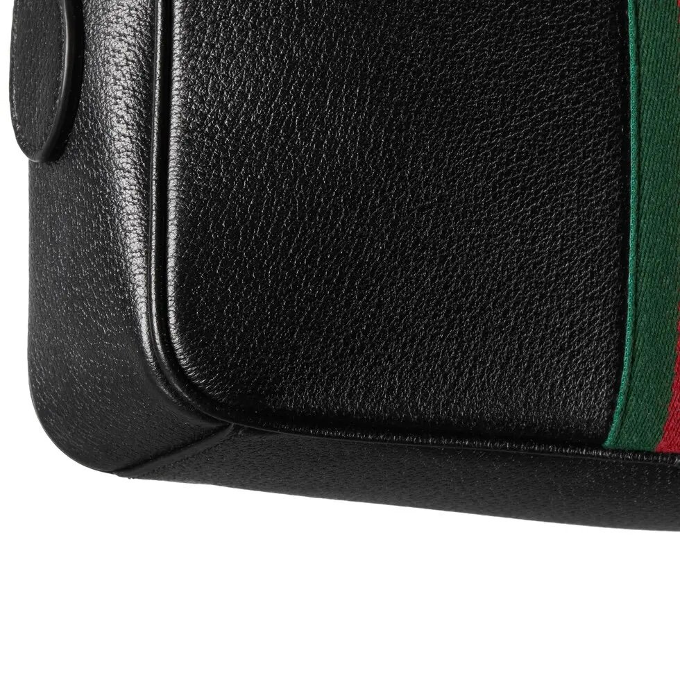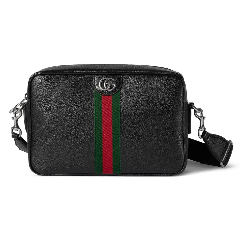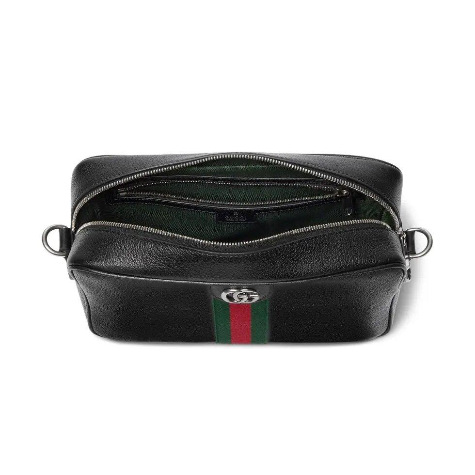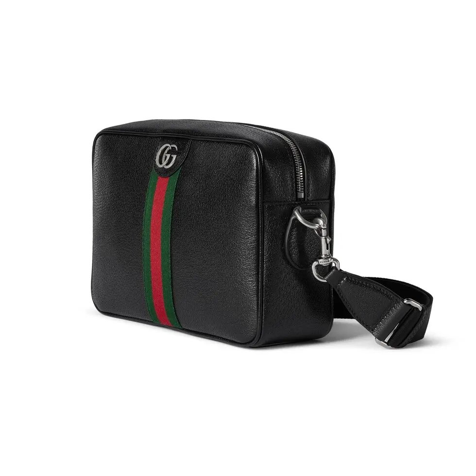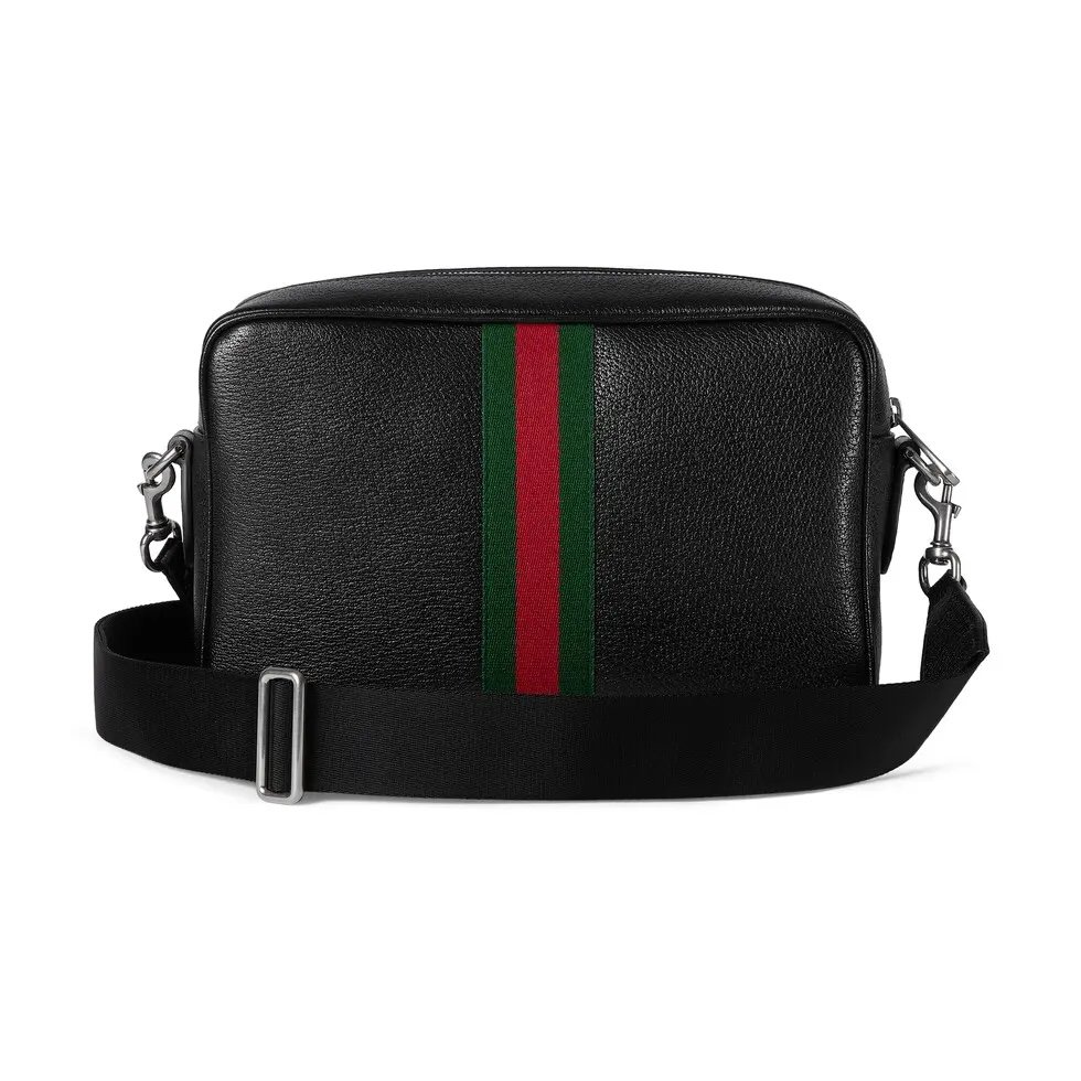 حقيبة يد سوداء أنيقة من الجلد المحبب (أو الجلد المزخرف/المحصّب)، بتصميم مستطيل الشكل. تتميز الحقيبة بشريط ويب أخضر وأحمر مميز يمتد عموديًا في المنتصف. في الجزء العلوي من هذا الشريط، يوجد شعار Gucci المزدوج “GG” الفضي اللون. الحقيبة مزودة بحزام كتف قابل للتعديل والفصل، ومثبت بحلقات معدنية فضية على جانبي الحقيبة. لديها سحاب علوي للإغلاق. إنها حقيبة عملية وأنيقة، مناسبة للاستخدام اليومي أو المناسبات الكاجوال.