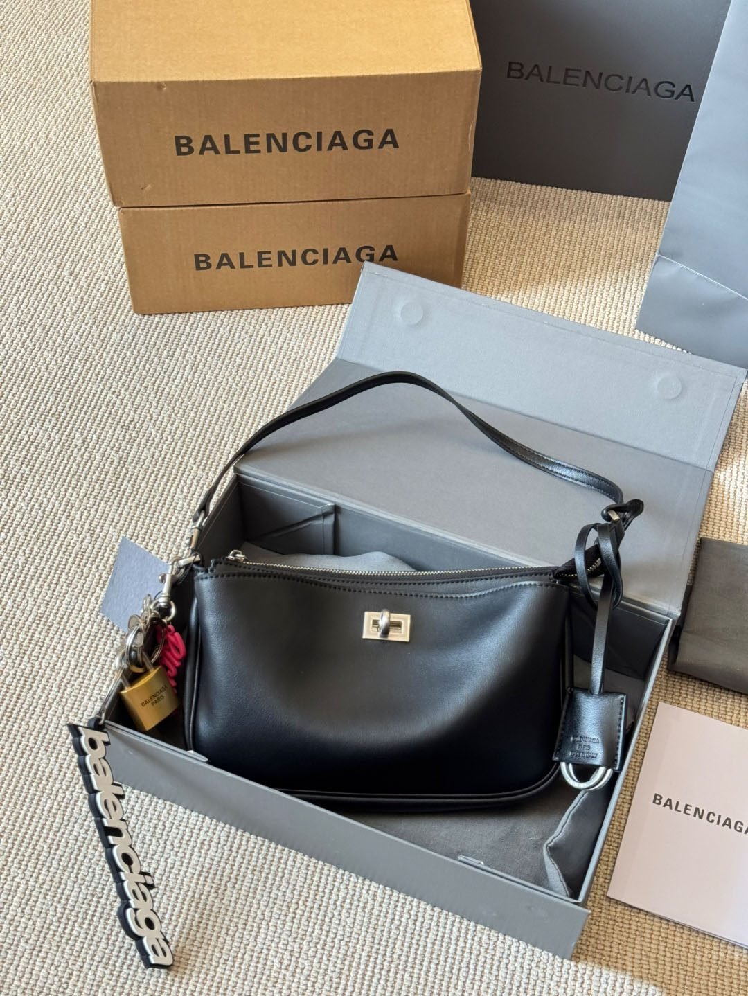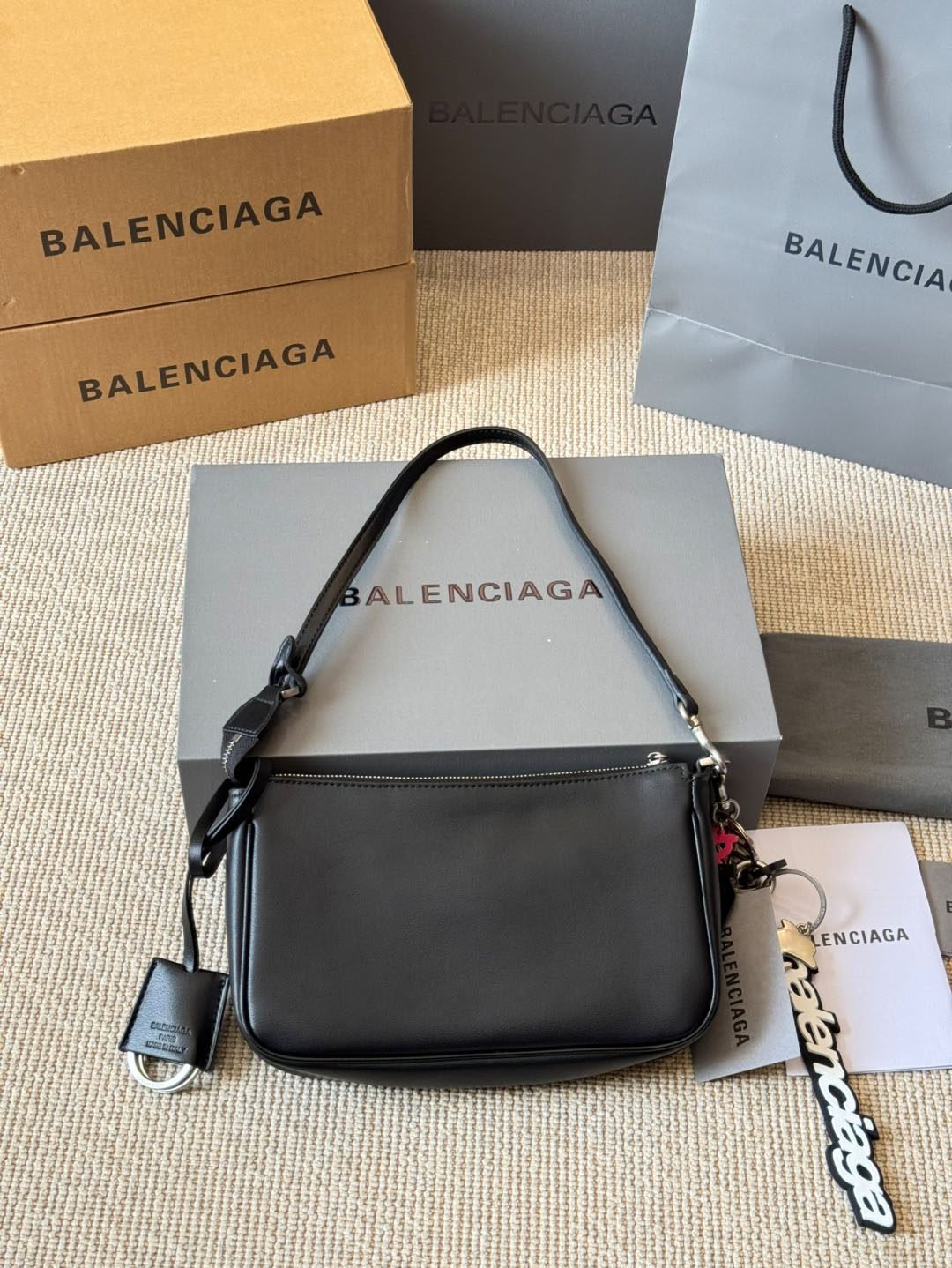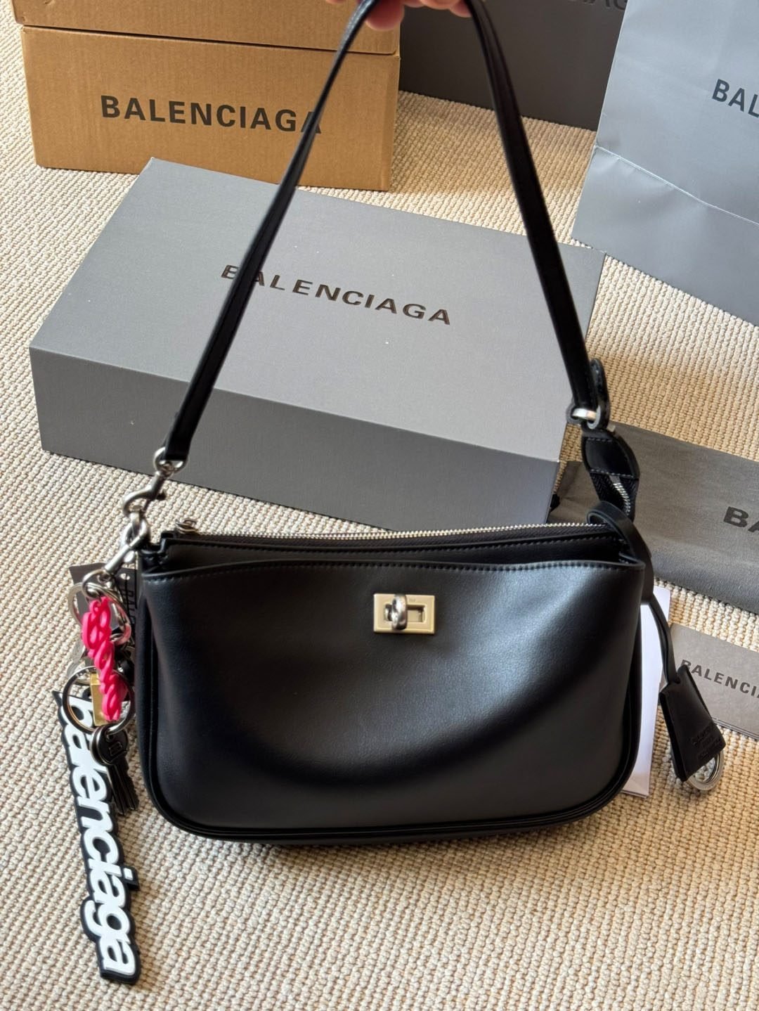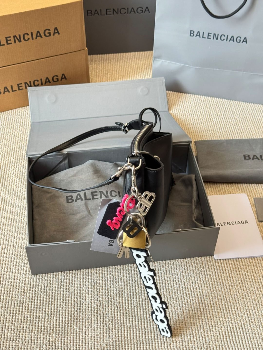 - تفاصيل مميزة بشعار العلامة: السلسلة المعدنية تحمل نقش Balenciaga لتعزيز الهوية الفاخرة.