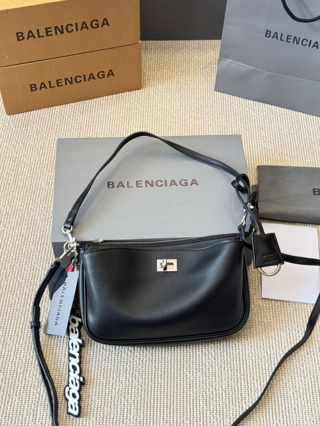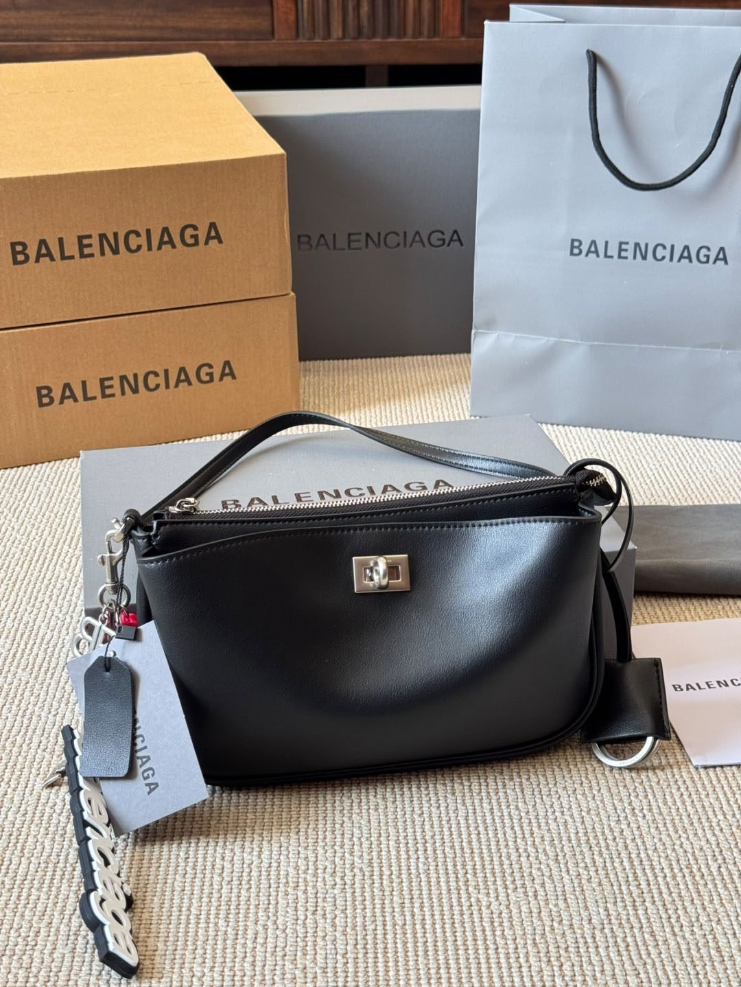 حقيبة Balenciaga هذه تجسد الأناقة العصرية بامتياز. مصنوعة من جلد فاخر باللون الأسود العميق، تضفي لمسة راقية على أي إطلالة.