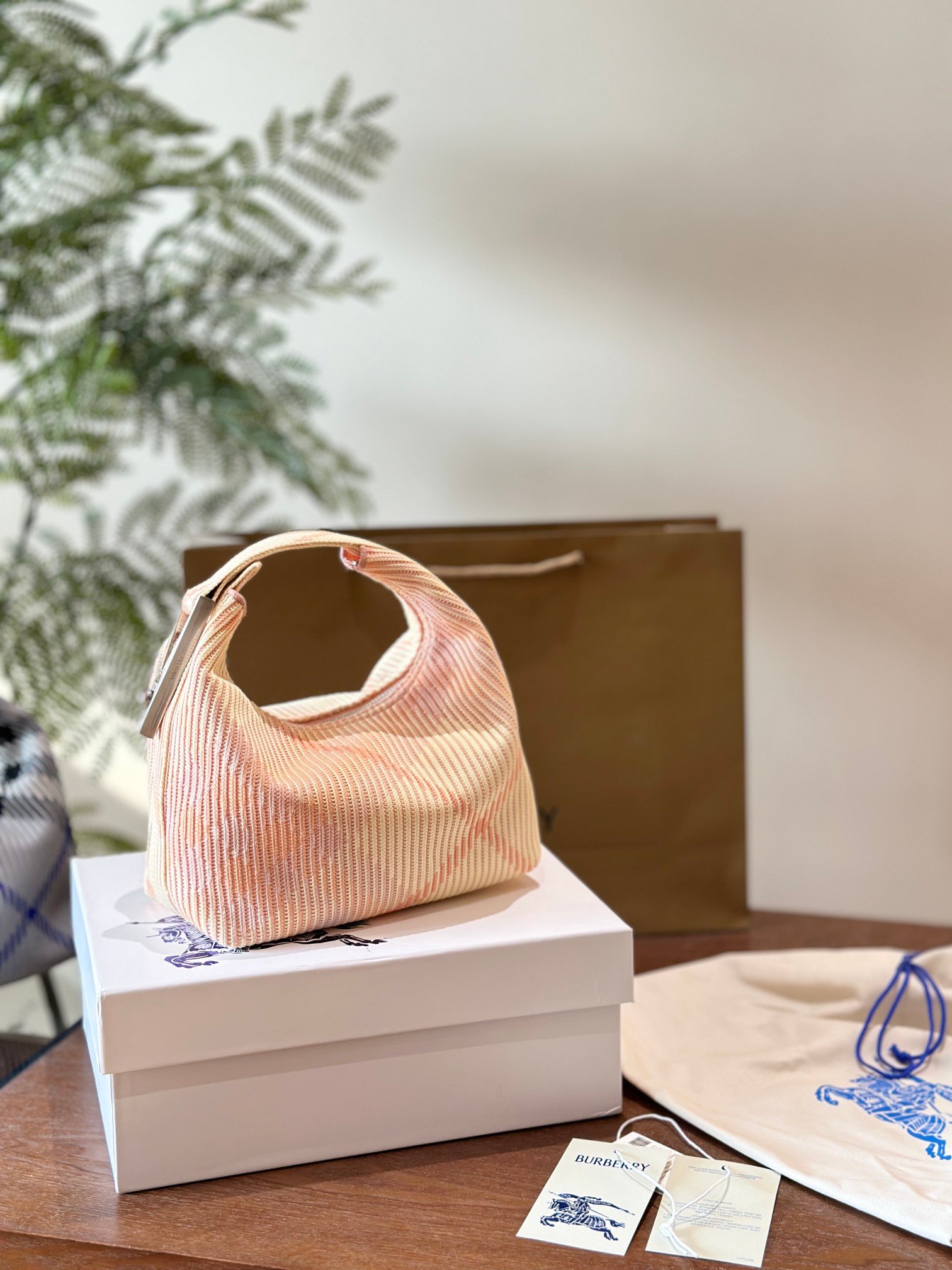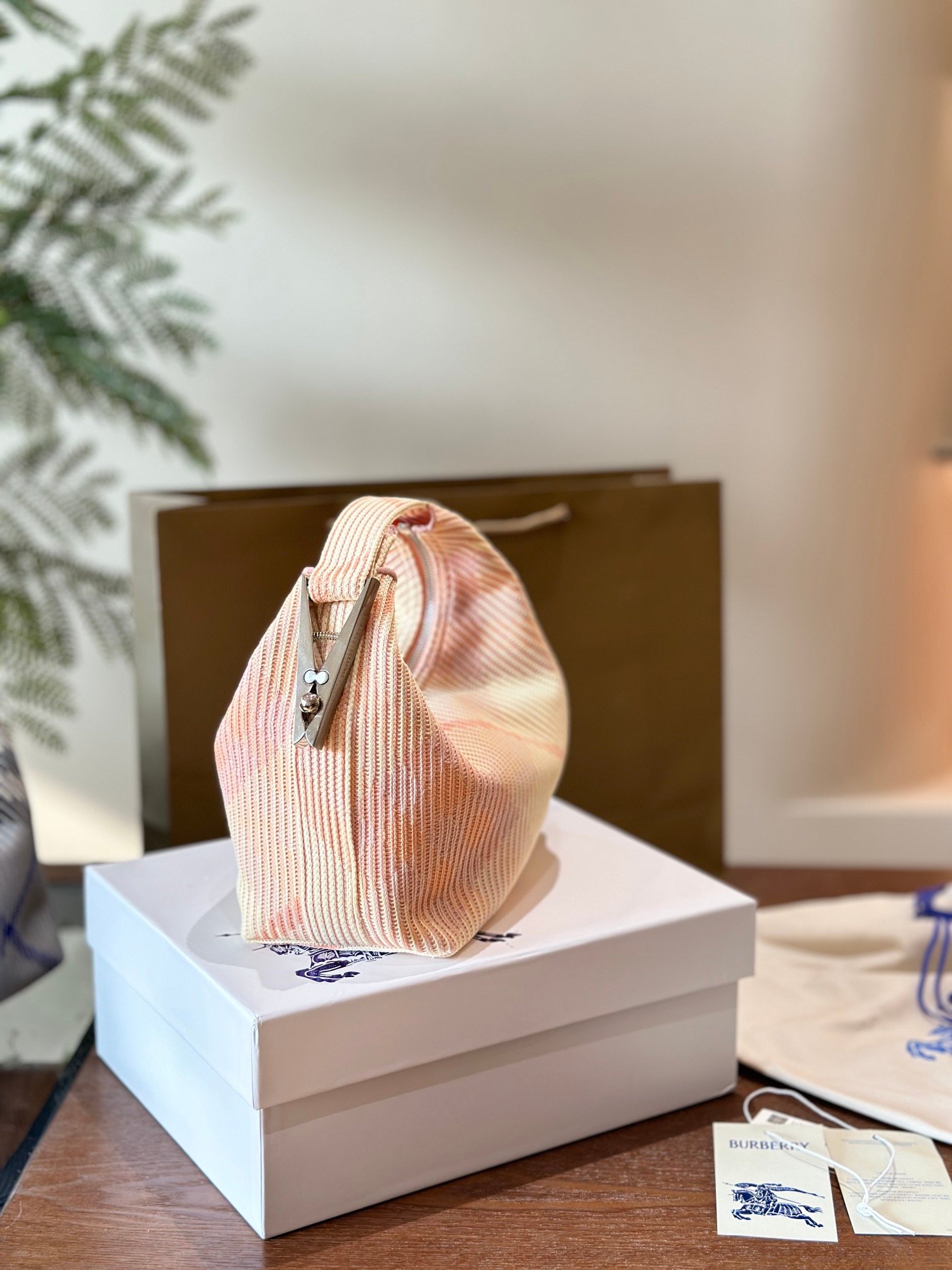 حقيبة يد Burberry, بتصميمها الفريد الذي يجمع بين الفخامة العصرية واللمسة الفنية بتدرجات اللون الوردي والأبيض.