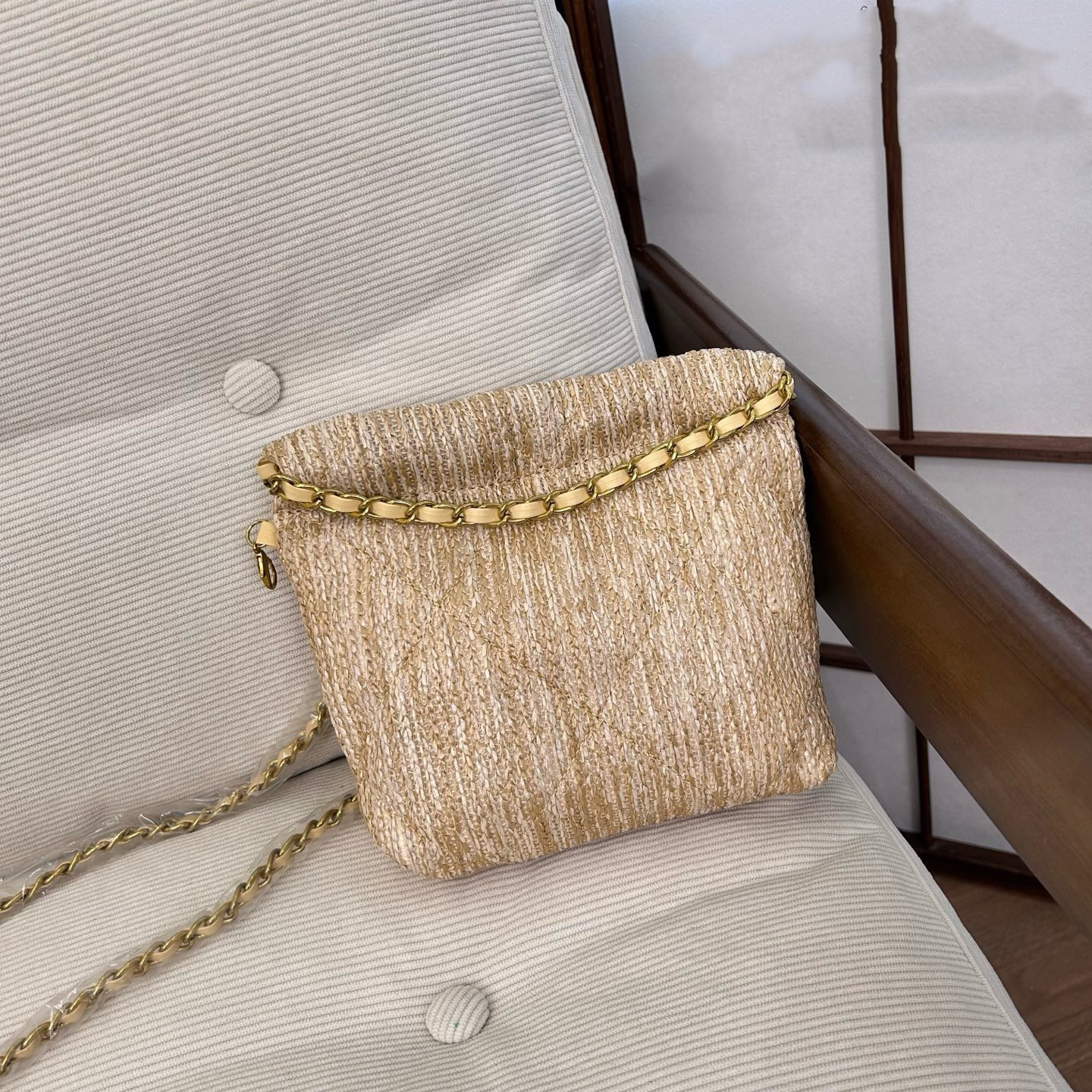 حقيبة شانيل المنسوجة، المفضلة لدى العديد من النجمات، تتميز بمظهرها الأنيق، فهي تتسع للعديد من الأغراض وتبدو أنيقة. ملمسها الناعم والعصري يجعلها أنيقة للغاية. المقاس: ١٧*١٨ سم