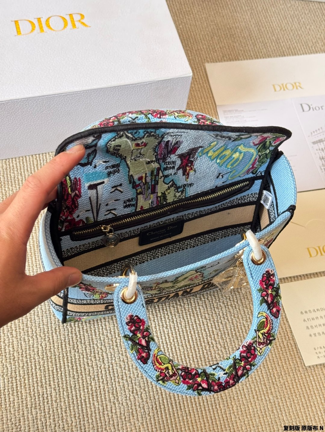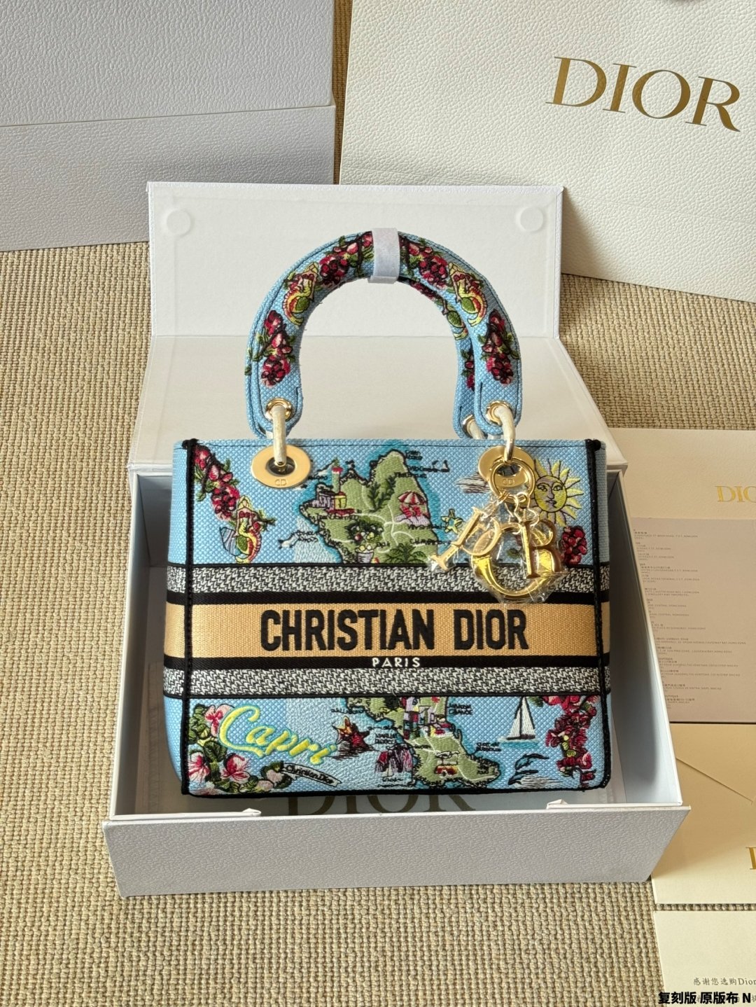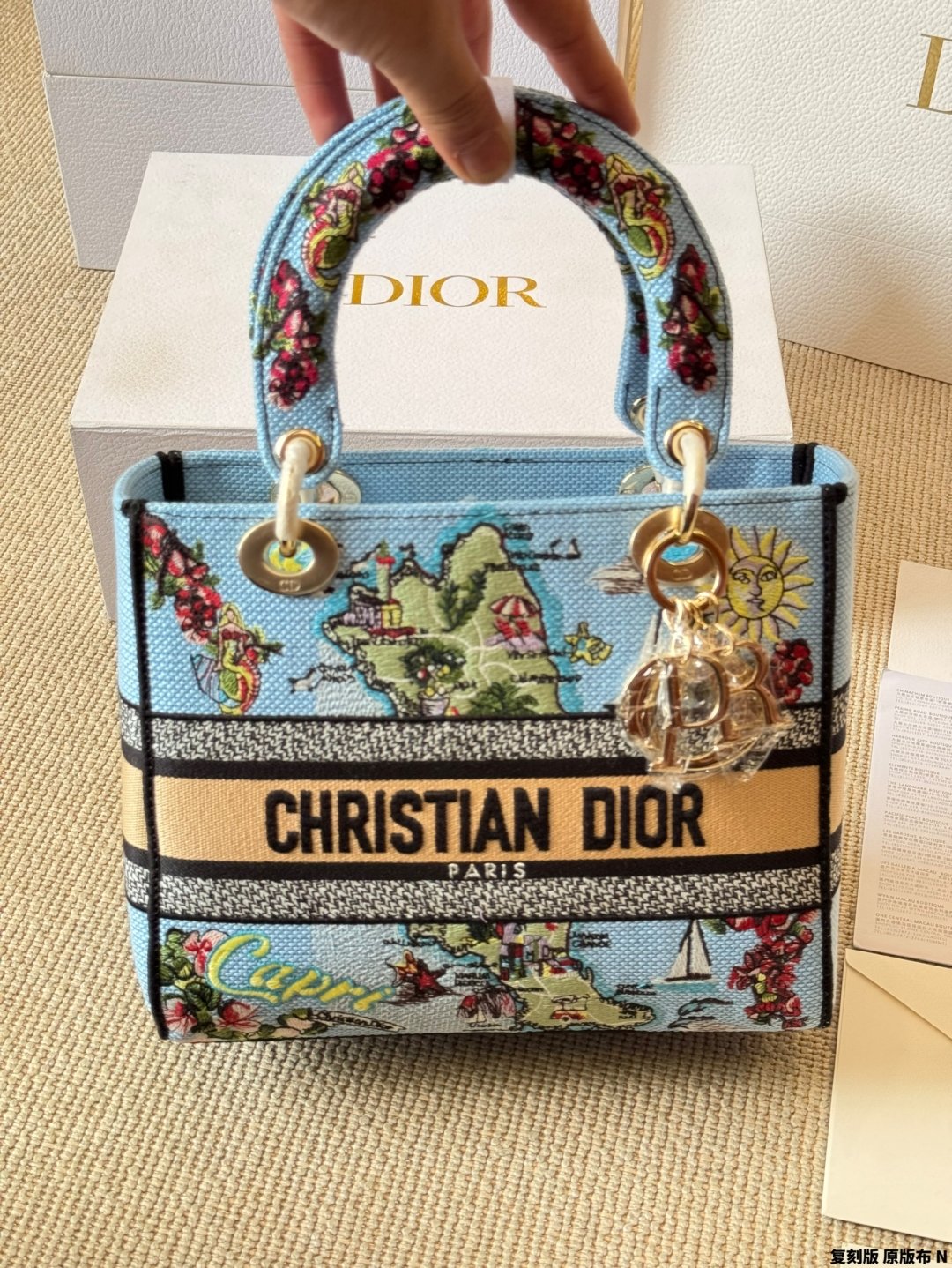 بتصميم فريد وفني، مصنوعة من قماش باللون الأزرق الفاتح 💙 مع تطريزات ملونة 🎨 لخريطة مدينة Capri الإيطالية.