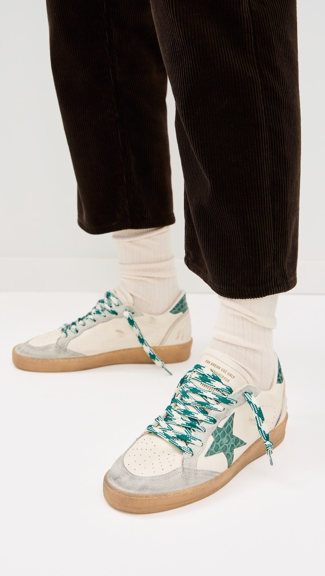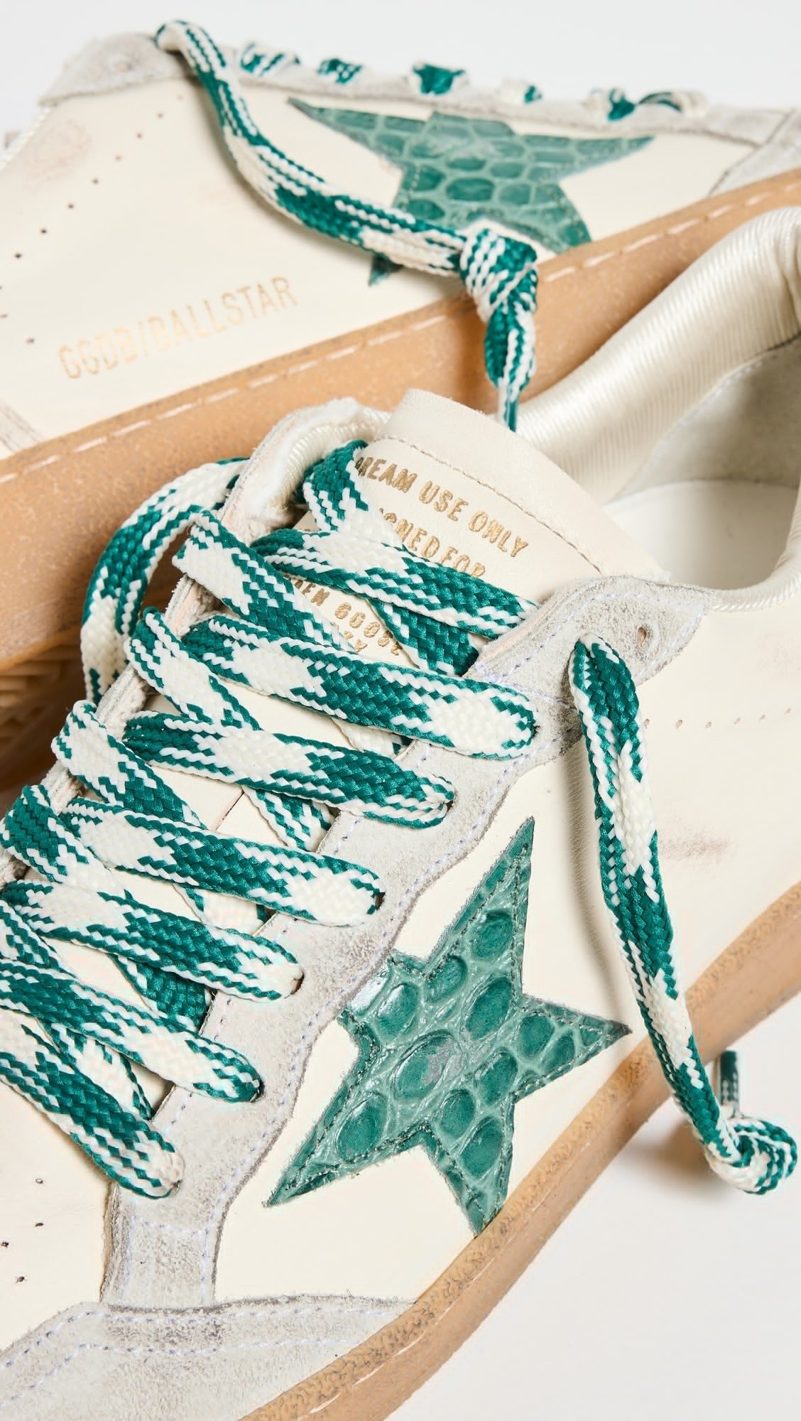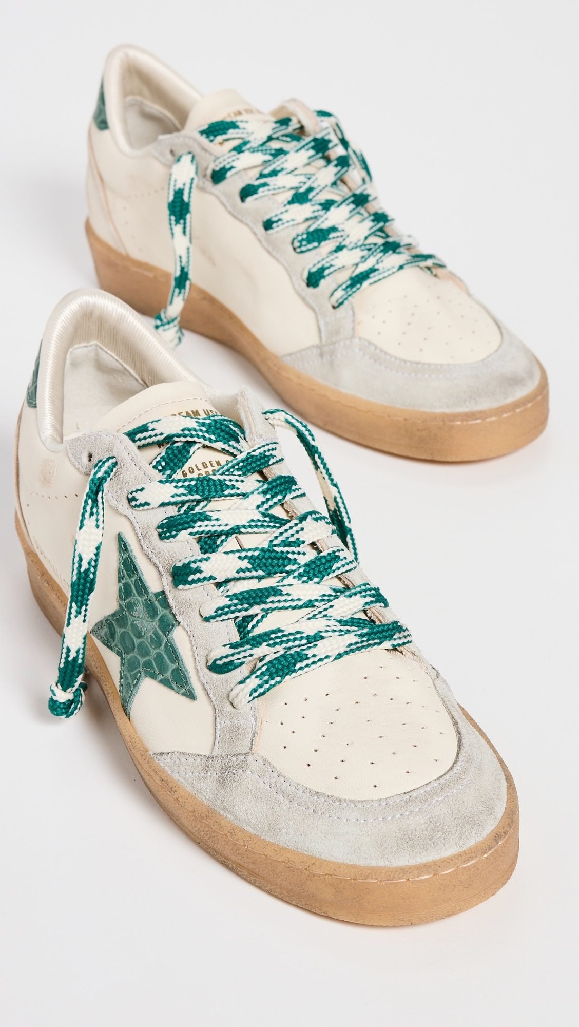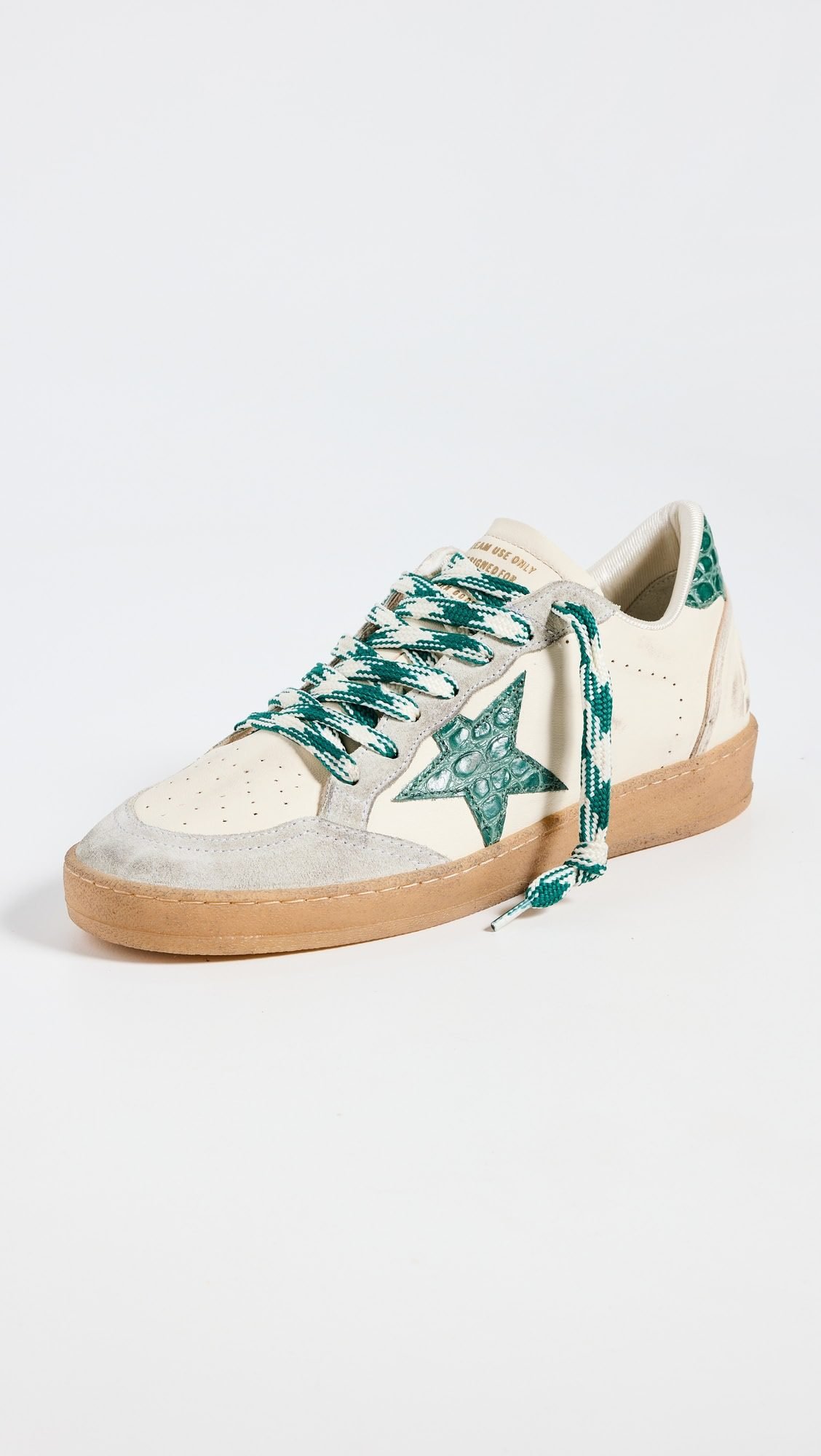 هذا الحذاء الرياضي يجسد الأناقة العصرية بلمسات فريدة من نوعها. مصنوع من الجلد الأبيض الفاخر، يكتمل تصميمه بتفاصيل من الجلد المدبوغ الرمادي التي تمنحه طابعًا راقيًا. على الجانب، تبرز نجمة كبيرة من الجلد الأخضر بنقشة مميزة، لتضيف لمسة جريئة وأنيقة في آنٍ واحد.