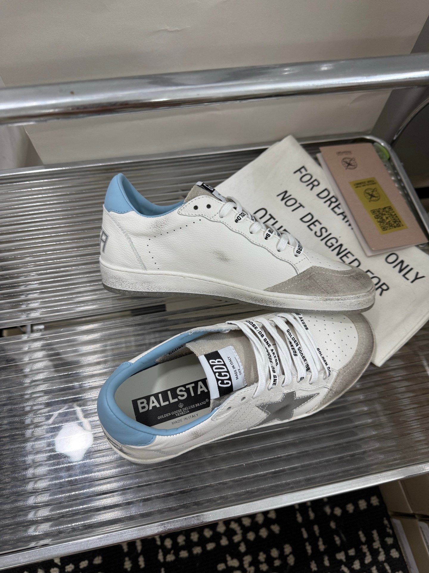 يبرز الحذاء بوجود شعار النجمة الشهير للماركة باللون الفضي 🌟، مع لمسة باللون الأزرق الفاتح 💙 على الكعب الداخلي للحذاء.