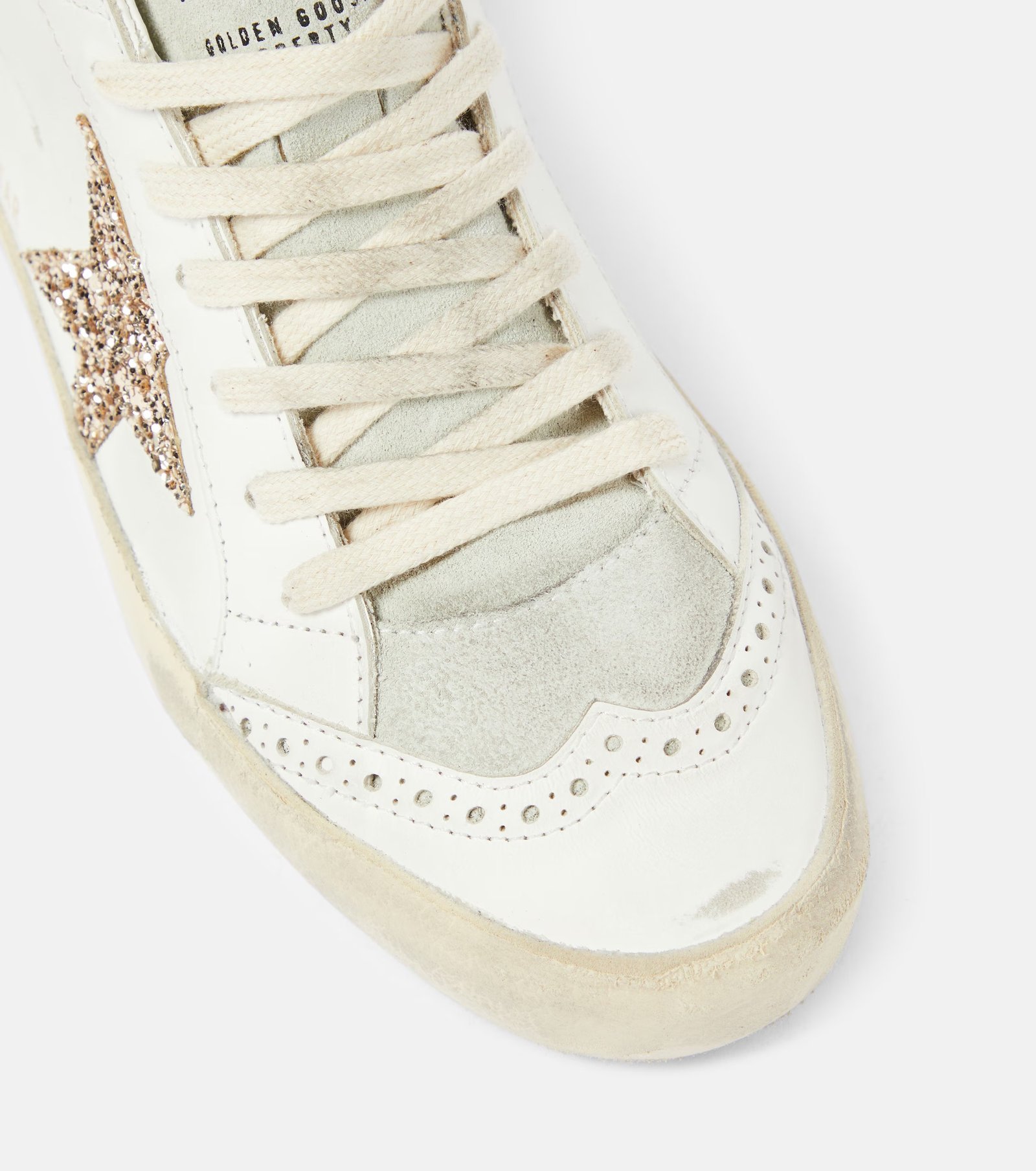 صُمم الحذاء من الجلد باللون الأبيض، وتبرز عليه نجمة الأيقونية باللون الذهبي اللامع، مما يمنحه مظهراً جريئاً.