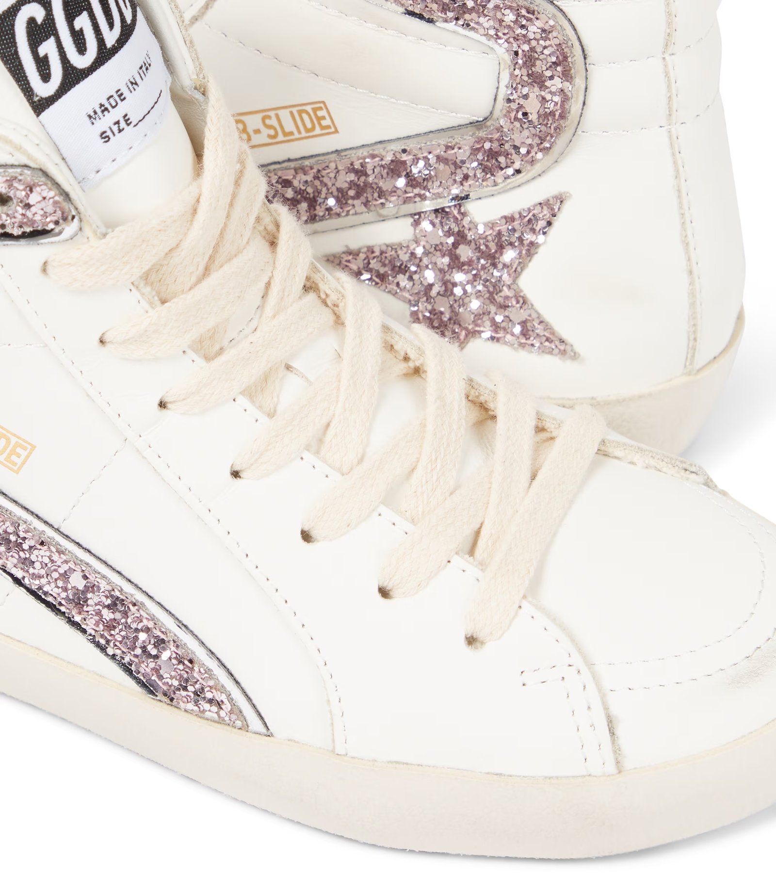 يزدان الجانب الخارجي بشعار النجمة الأيقوني من Golden Goose ببريق الترتر الوردي الفاتح المتلألئ،