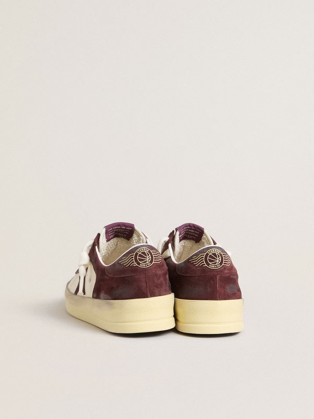 صُمم الحذاء بجلد فاخر باللونين البيج الفاتح والعنابي، مع نجمة بارزة باللون العنابي أيضاً،