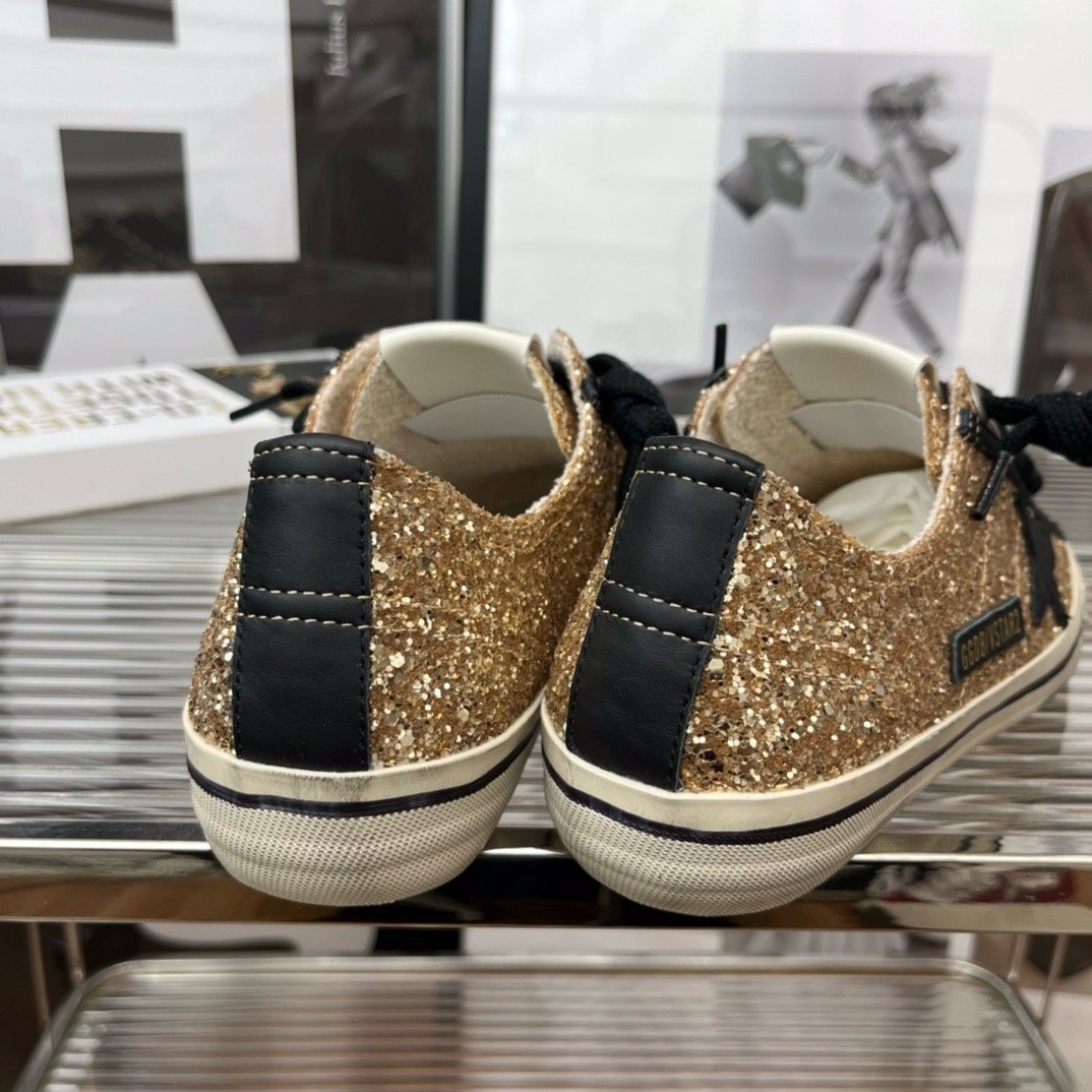 تبرز عليه نجمة Golden Goose الأيقونية بجلد الشمواه الأسود الداكن، مما يخلق تبايناً درامياً وأنيقاً مع البريق الذهبي.