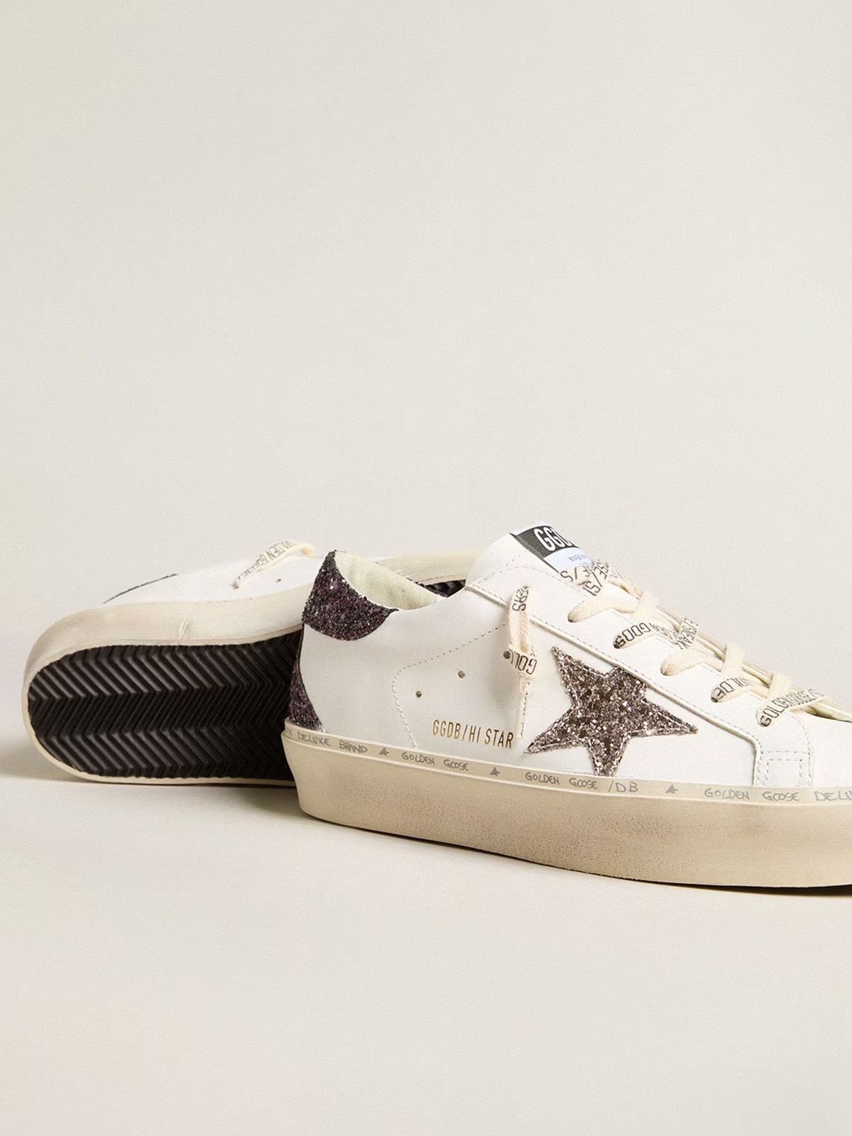 Golden Goose موديل Hi Star يتميّز بالجليتر البنفسجي على الكعب والنجمة الفضية اللامعة – فخم وملفت للنظر 👟✨