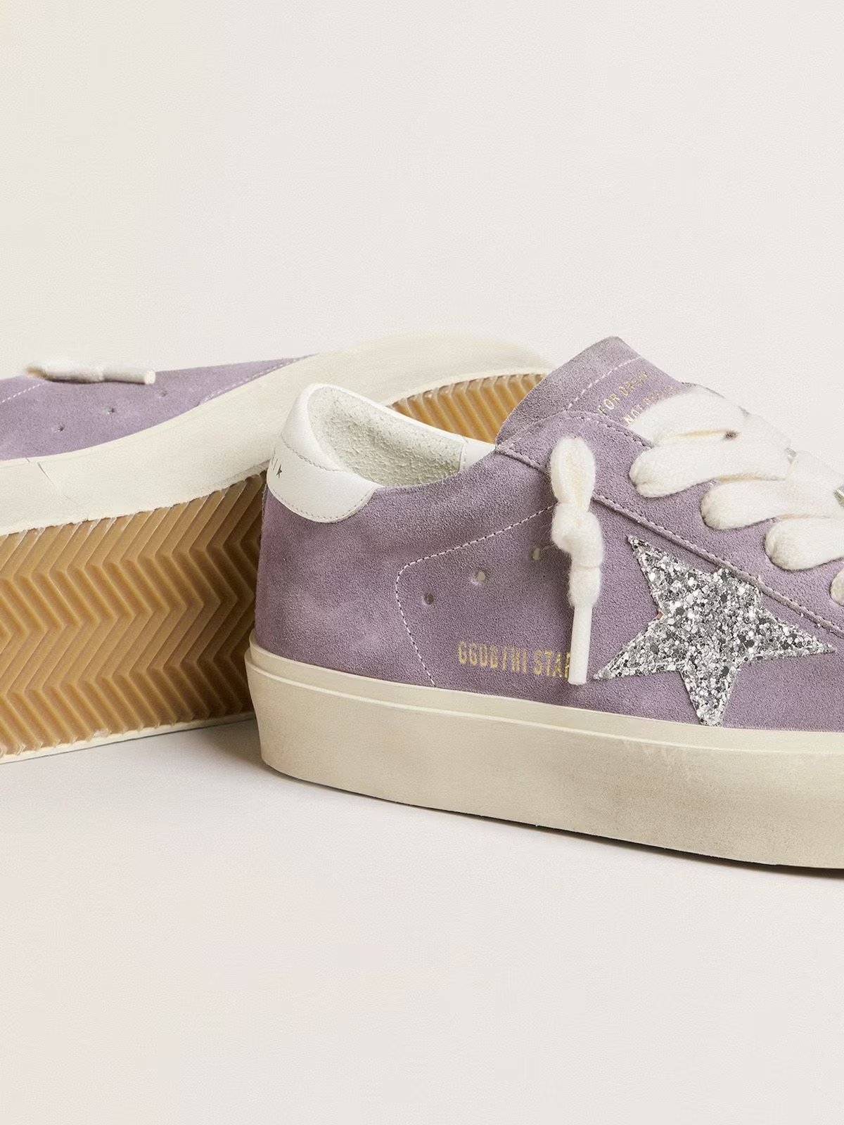 يتميز بتصميم جذاب من الشمواه باللون الليلكي الفاتح، مع نجمة Golden Goose الأيقونية التي تتلألأ بالغليتر الفضي، مما يضيف لمسة من البريق والسحر. ✨💜