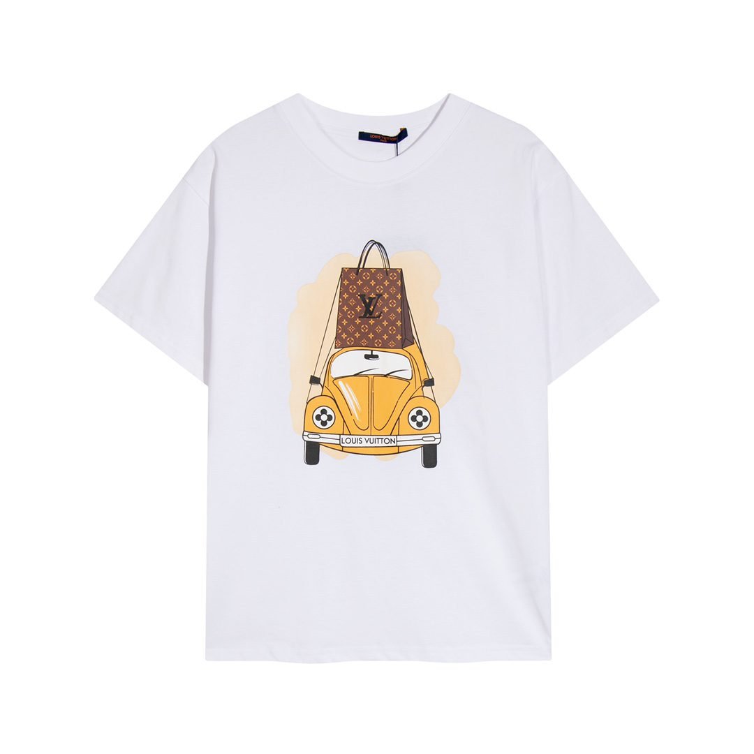 تيشيرت لويس فويتون Lv بطبعة سيارة كرتونية بشعار زهرة قديمة وأكمام قصيرة.
