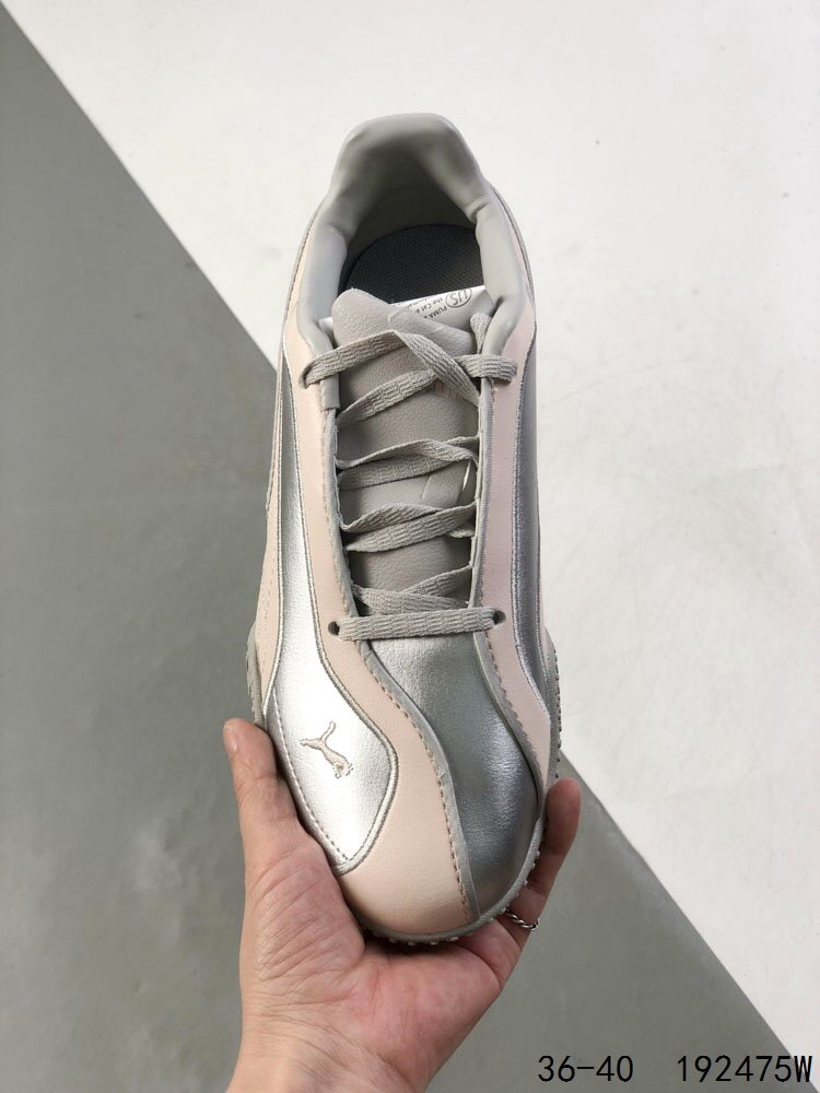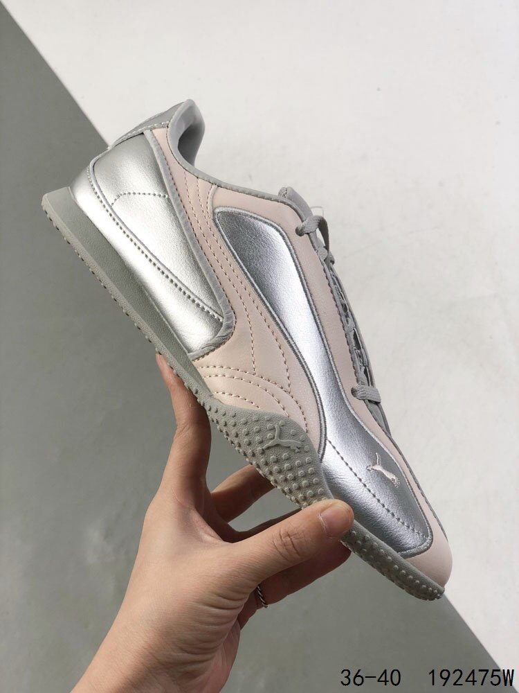 صُمم الحذاء من الجلد الناعم، حيث يجمع بين اللونين البيج الفاتح والفضي اللامع