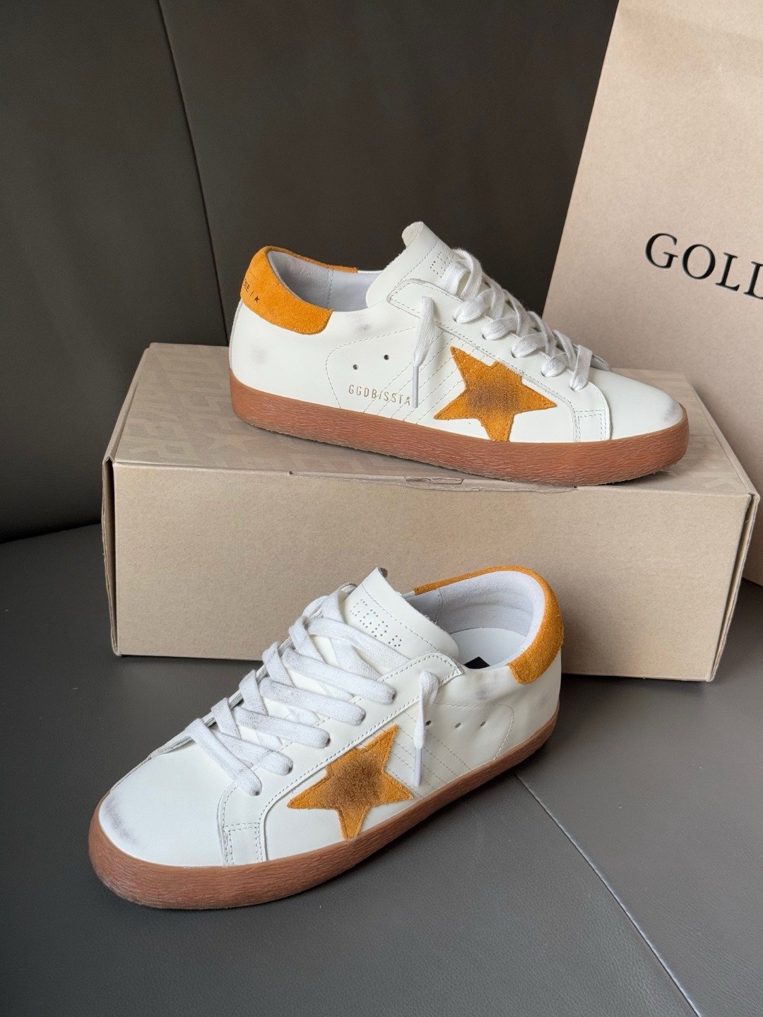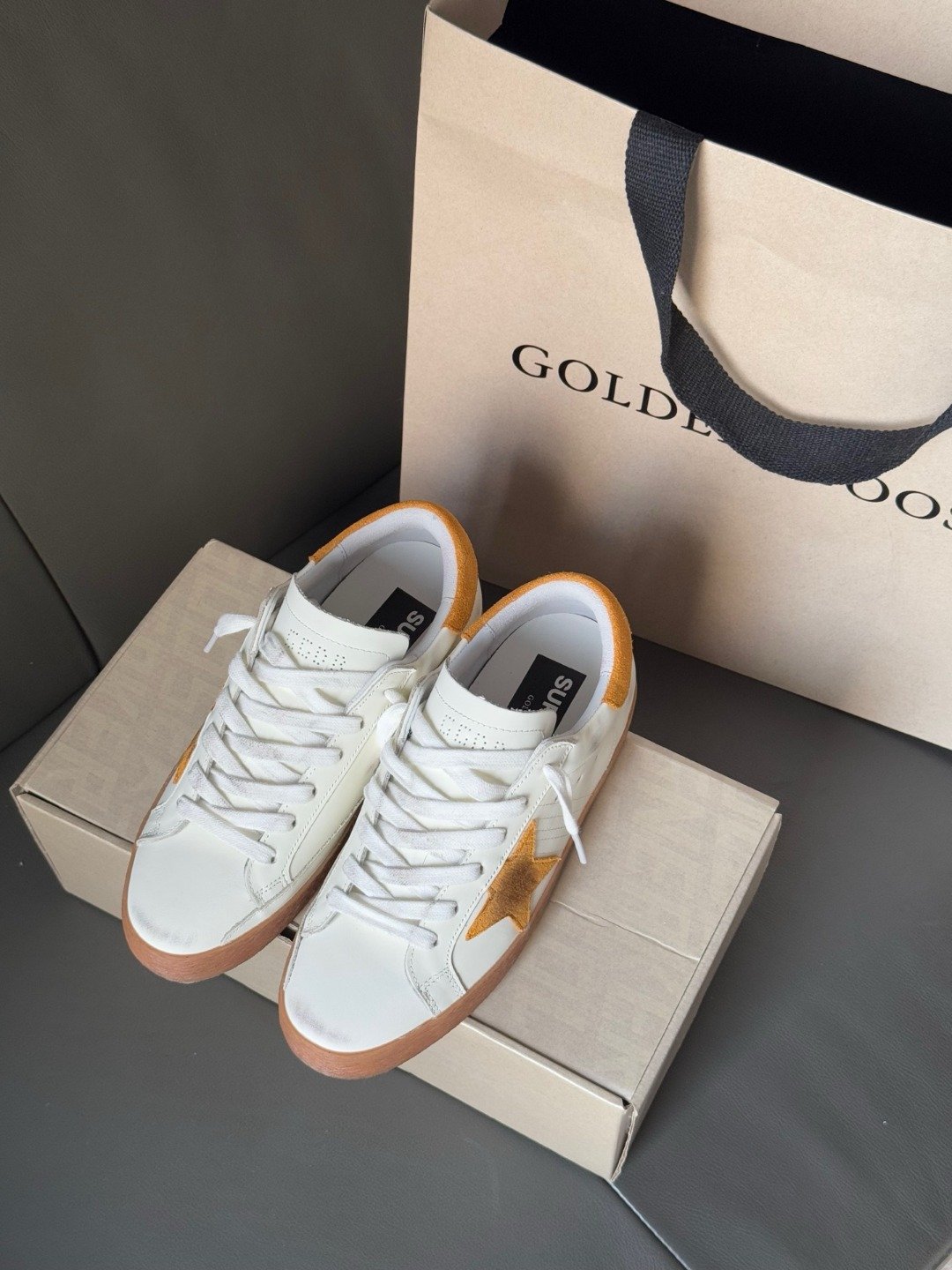 حذاء Golden Goose Super-Star, باللون الأبيض الناصع، يتألق بنجمة برتقالية دافئة وكعب بنفس اللون،