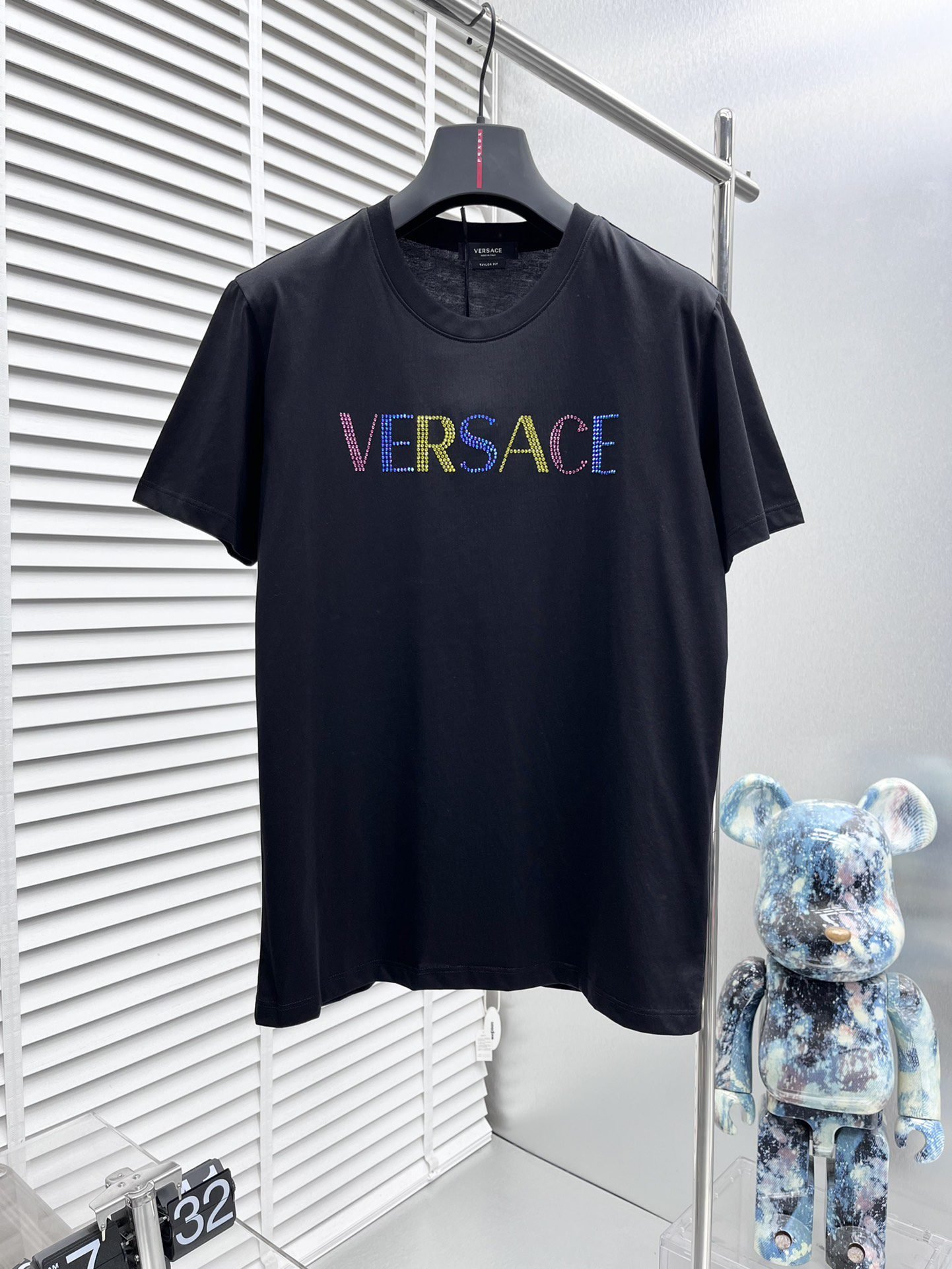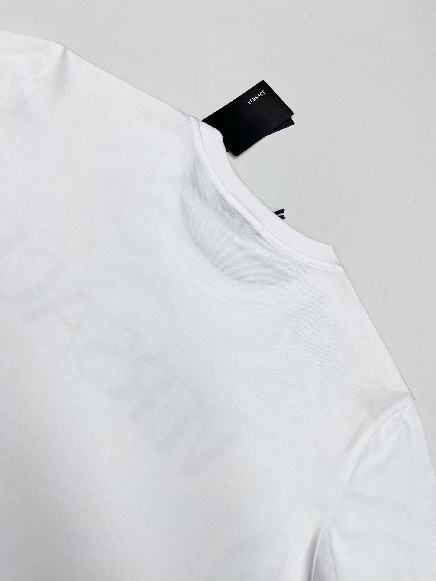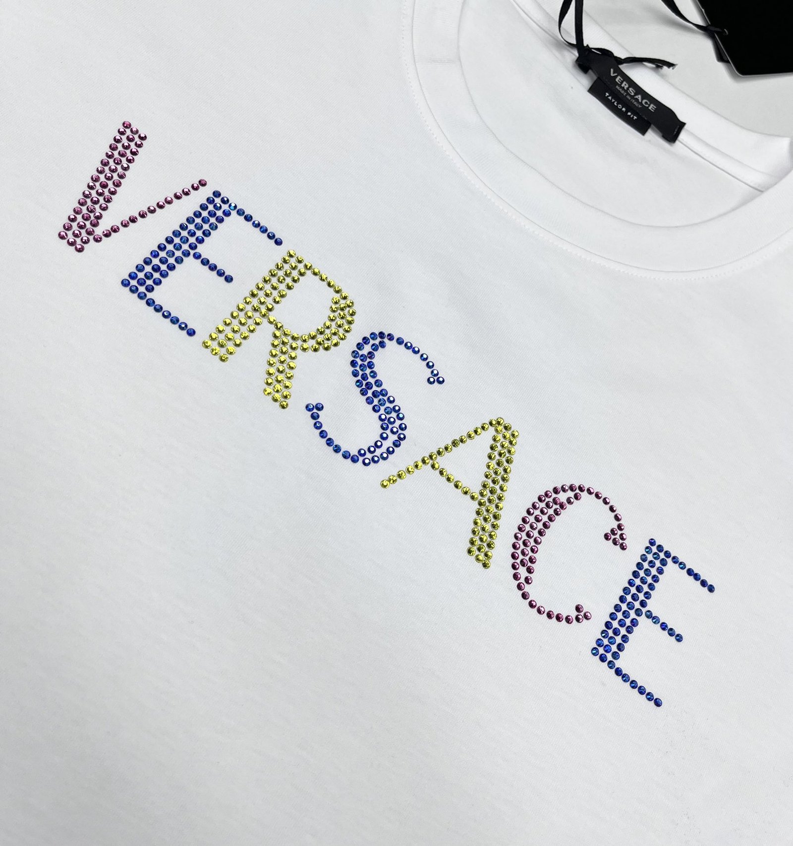 تصميم جديد من فيرساتشي بأكمام قصيرة، مطبوع عليه شعار بحروف ماسية بلون الماس، بطباعة حرارية.
